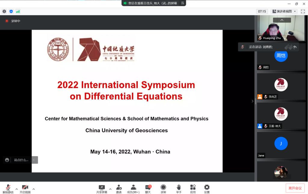 5月14-15日,“微分方程国际会议”通过腾讯会议线上举行,此次研讨会是中国地质大学(武汉)70周年校庆的系列学术活动之一,以更好地交流微分方程理论及相关领域的最新研究成果和学术发展动态为主旨,为国内外同行专家之间的学术交流与合作提供平台。开幕式由中国地质大学(武汉)数学与物理学院院长郭上江教授主持,大数据与人工智能学院周恺、赵舵舵两位教师应邀参会。